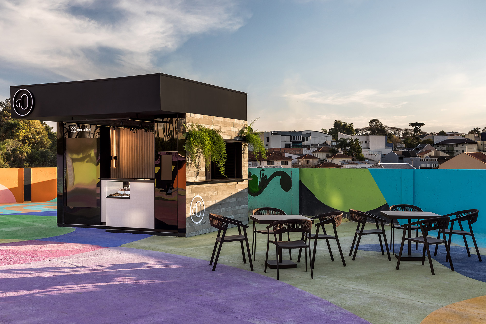 André Henning – Cafeteria. Aparecendo como uma inserção urbana no meio da praça, o projeto conversa com o público que está de passagem, proporcionando uma pausa para tomar um bom café. Por meio das formas ortogonais e pelo uso de materiais como as placas de concreto aparente, metal preto, perfis de led e painéis de comunicação visual, o ambiente busca expressar os traços da cidade contemporânea e suas diversas nuances, criando um espaço instagramável.